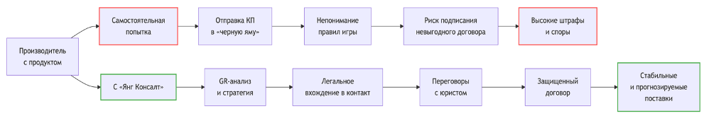 Для производителя выход на полки федеральных сетей — это сложная правовая и административная процедура. Жесткие требования ритейла, объемные договоры и необходимость выстраивания диалога на высоком уровне требуют особого подхода. «Янг Консалт» специализируется на использовании инструментов GR (Government Relations) и глубокой правовой экспертизы для построения эффективных и законных бизнес-коммуникаций между производителем и сетью.